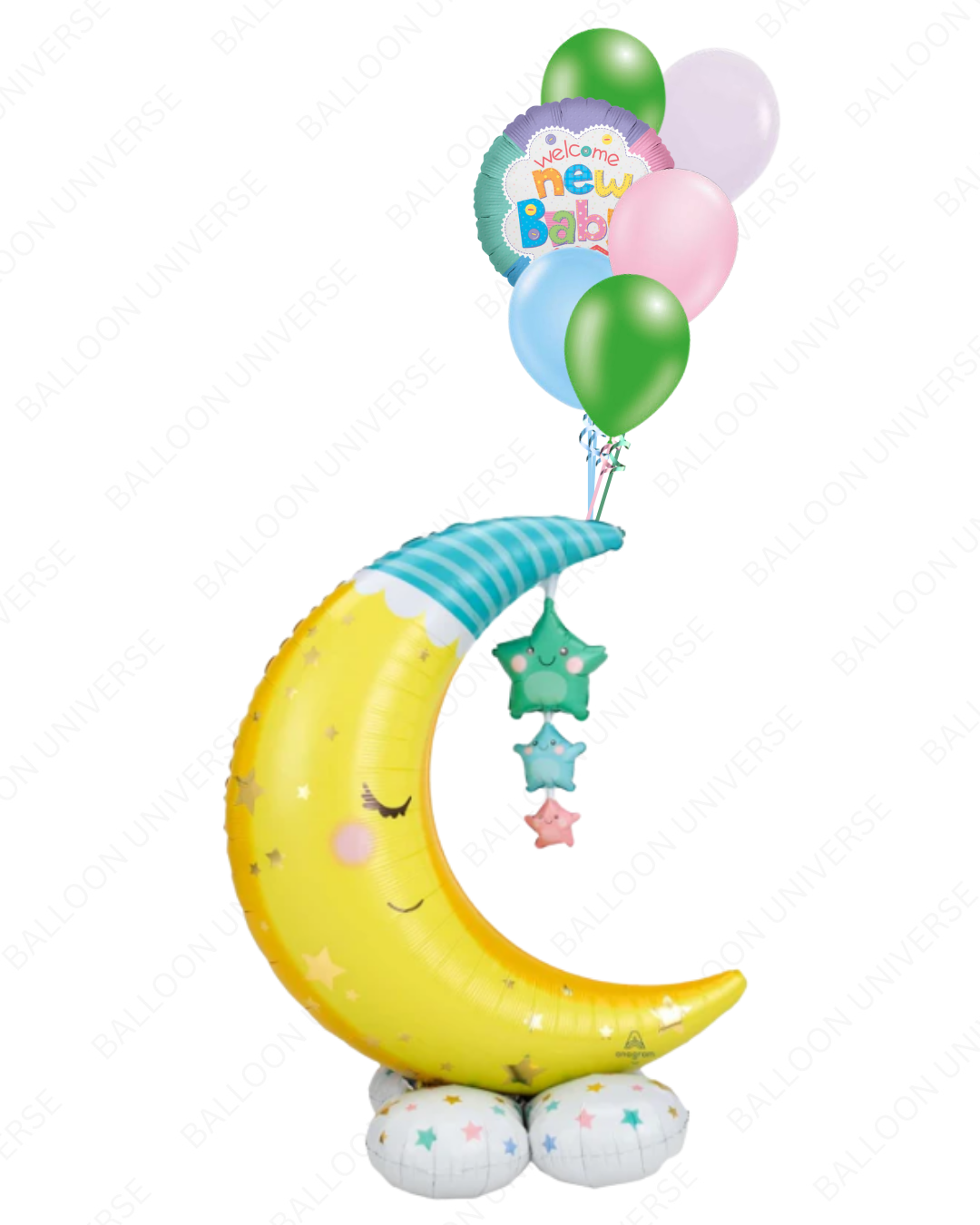 Celebrate a new arrival with this charming balloon bouquet. It includes an Airwalker Moon balloon (air-filled) and a 18” “Welcome New Baby” round mylar balloon. Complementing these are 5 helium-filled 11” latex balloons in vibrant Green, Pink, Blue, and Light Purple, creating a festive and colorful display. Ideal for baby showers, hospital visits, or home celebrations.