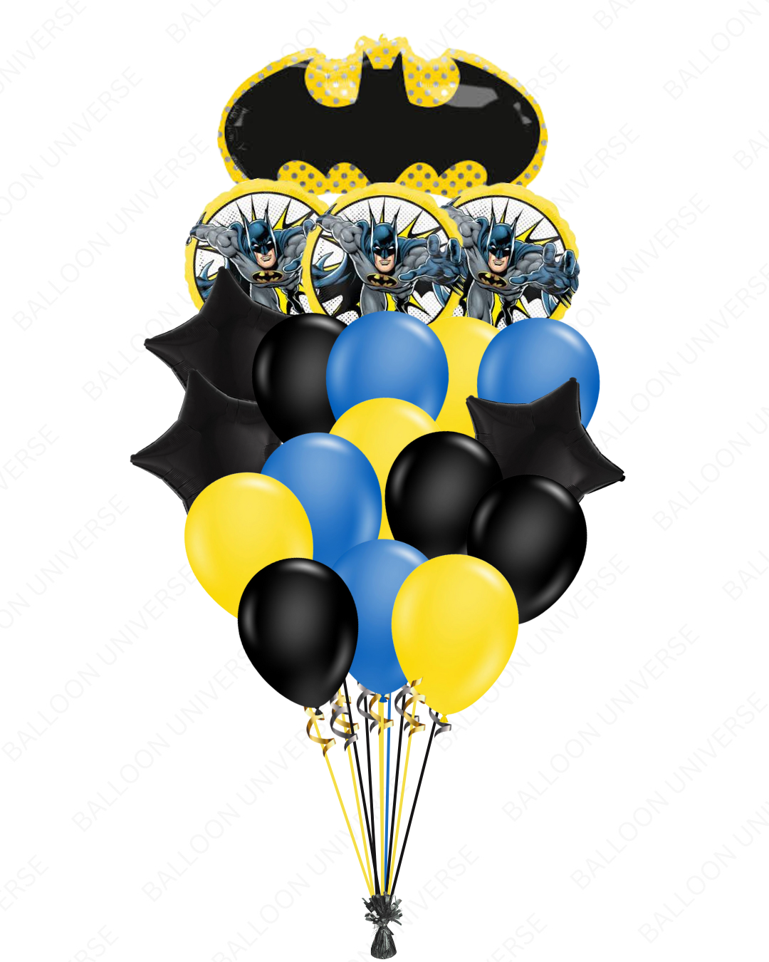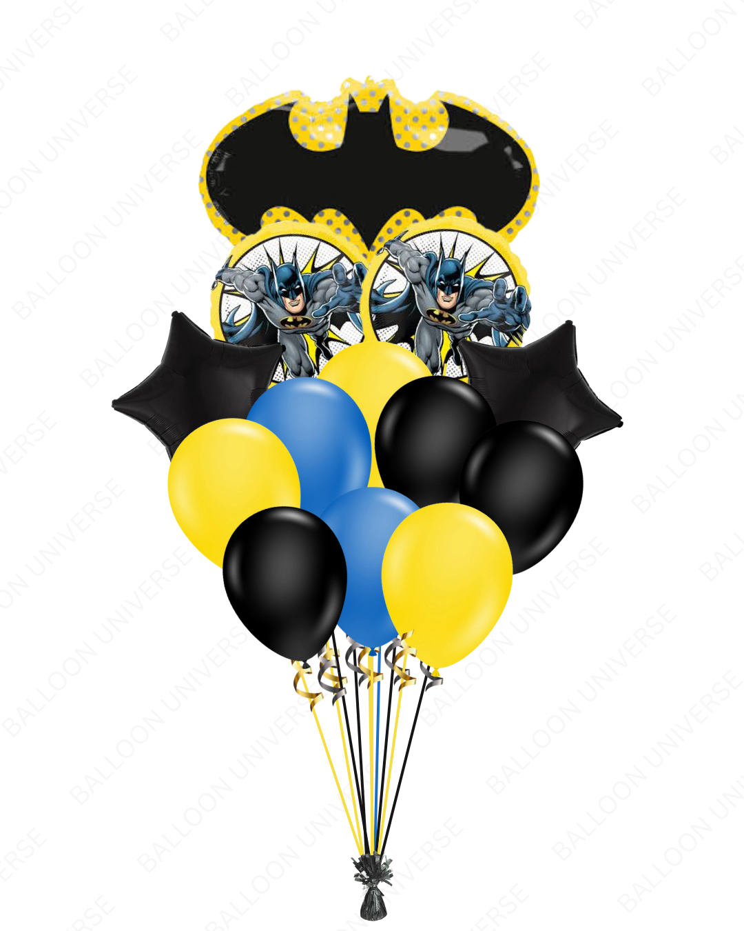 This Batman balloon bouquet lights up the party with superhero style. This standard set includes a big Batman logo mylar, two round ones with Batman prints, two black star mylar and latex balloons in blue, yellow and black. This bouquet is perfect for kids who love superheroes and action. Available in three variants.