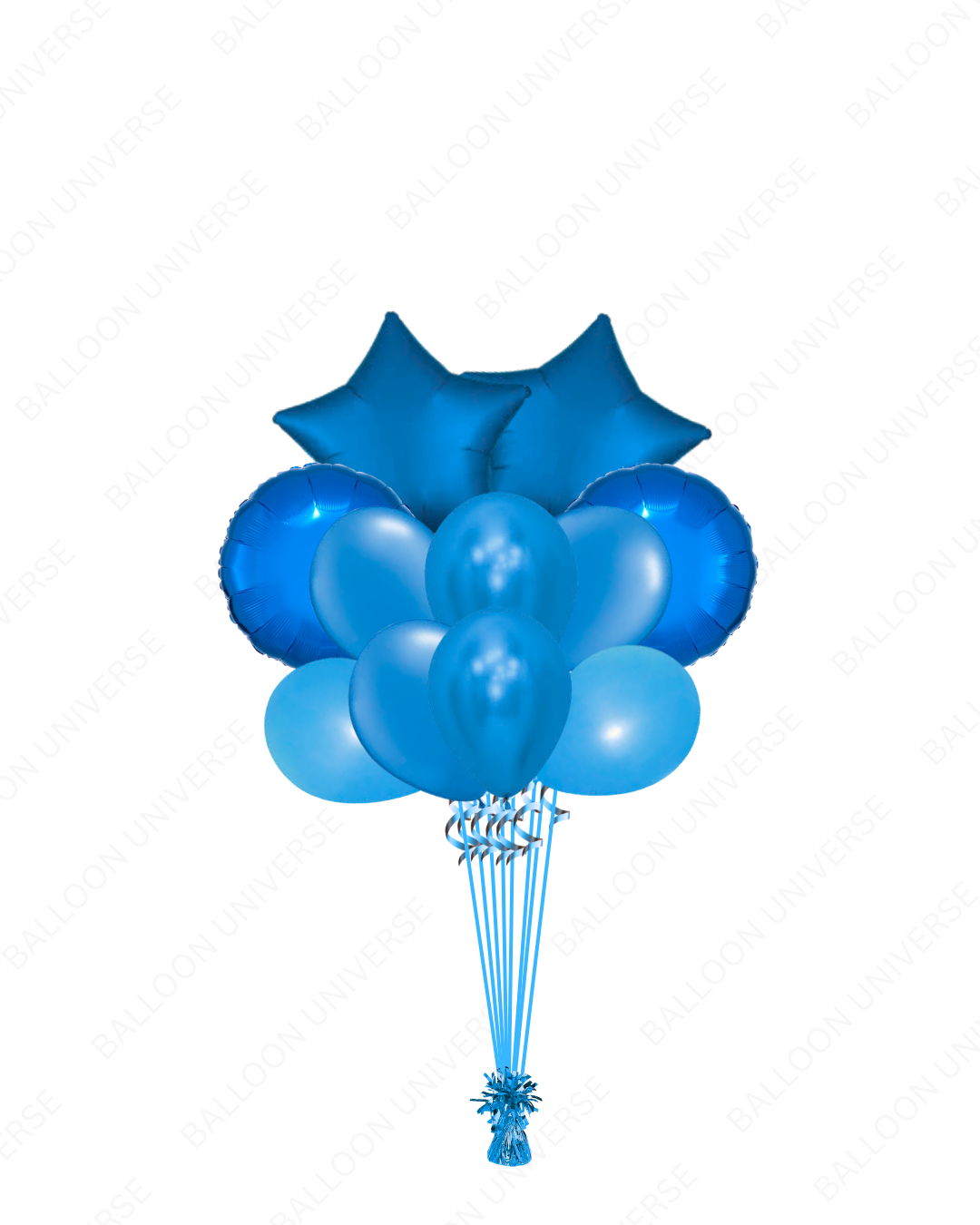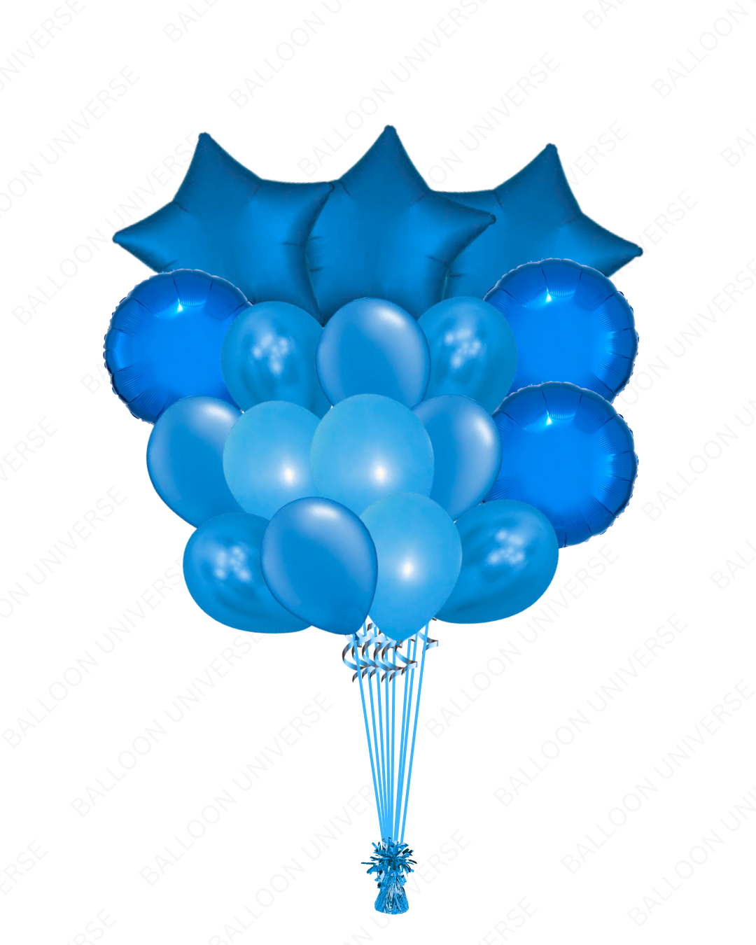 Balloons are the perfect way to bring beauty, joy, and color to any celebration. Our elegant blue balloon bunch includes blue star mylar, blue round mylar, chrome blue, and blue latex balloons. This balloon set is perfect for birthdays, weddings, baby showers, or any celebration that calls for stylish decor. Available in three size variations to suit both small gatherings and large events. All are helium-filled for a stunning floating effect and long-lasting display.