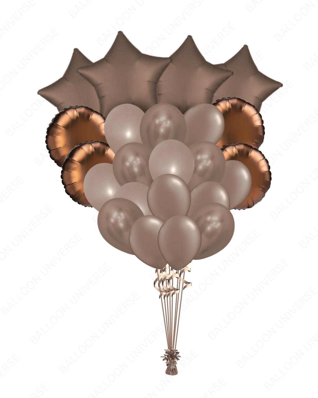 Balloons bring a delightful combination of elegance and warmth to any gathering. This bunch includes brown star mylar, brown round mylar, chrome Brown & cocoa latex balloons. This bouquet is perfect for birthdays, anniversaries, weddings, rustic-themed parties, corporate events, and cozy celebrations. Available in three size variations to suit different setups and styles. All are helium-filled for a beautiful floating effect and long-lasting display.