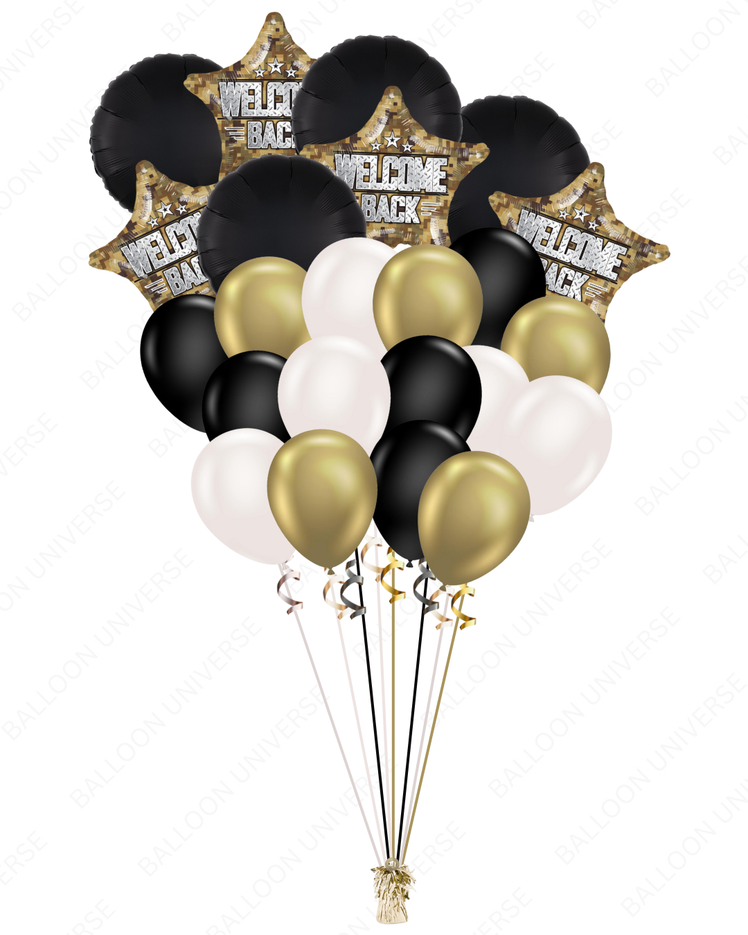 Welcome them home with this patriotic balloon bouquet filled with helium. This features "Welcome Back" star camo mylars, black round balloons, and latex balloons in golden, black, and white. The camo pattern and elegant color combination work for military homecomings, deployment returns, or welcome home celebrations. Available in three size options.