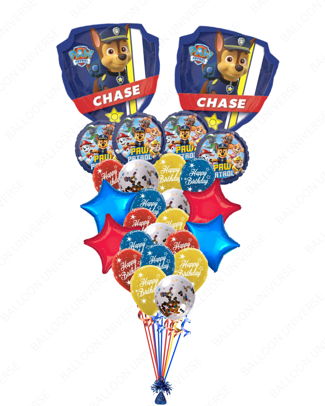 Bring the fun and adventure of Paw Patrol to the party. This chase balloon set includes a Supershape Chase mylar balloon, Paw Patrol round mylars, shiny blue and red star mylars and a cheerful mix of yellow, red and blue "Happy Birthday" latex and confetti balloons. This colorful and playful bundle adds energy and excitement to kids birthday celebrations. Available in three size variants.