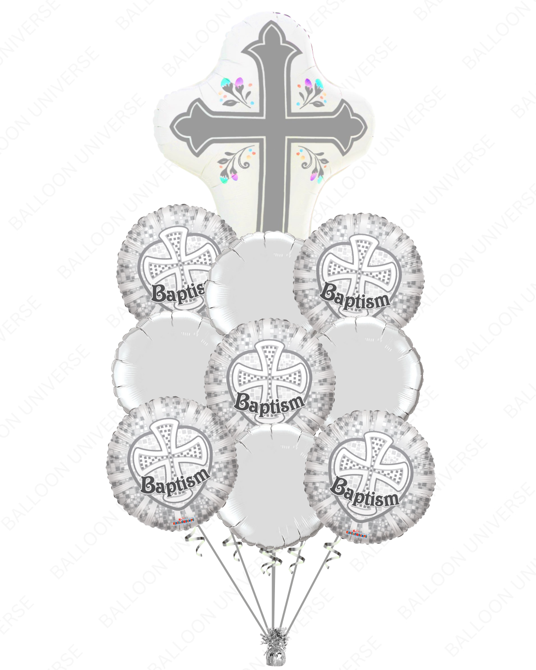 Honor this sacred moment with this elegant baptism balloon bouquet filled with helium. This features supershape cross mylars, "Baptism Cross" round balloons, and silver round mylars. Two size options provide different quantities to match your venue size. The silver and white palette creates a pure, reverent atmosphere suitable for religious celebrations.