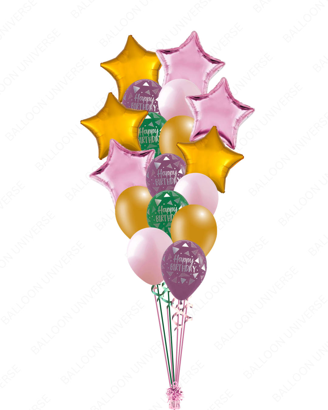 Celebrate your birthday with this Elegant Birthday Bouquet. This set features mylar balloons in gold & metallic pink. It also includes festive "Happy Birthday" print balloons in purple & green and latex balloons in soft pink & gold. Available in three size variants. Each balloon in the bouquets is filled with helium.