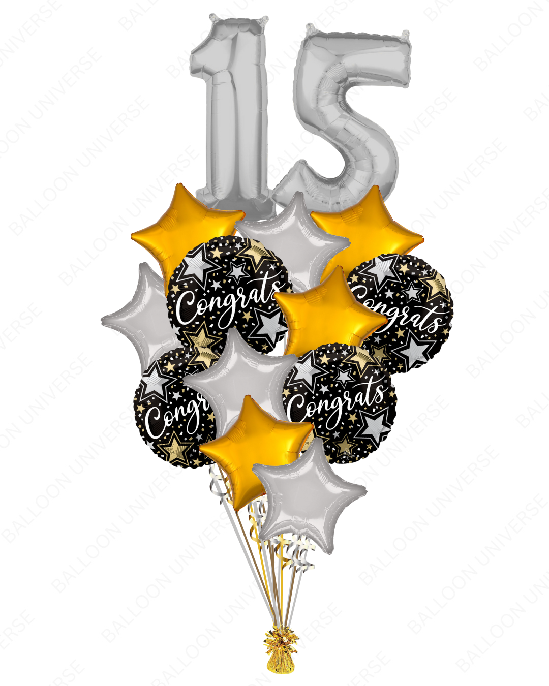 This eye-catching balloon set is perfect for any celebration. From birthdays to graduations, it adds a festive touch to every occasion. This bouquet comes with a large silver number mylar, vibrant congrats mylar, and shiny star accents. All bouquets are helium-filled. Available in three size variants.
