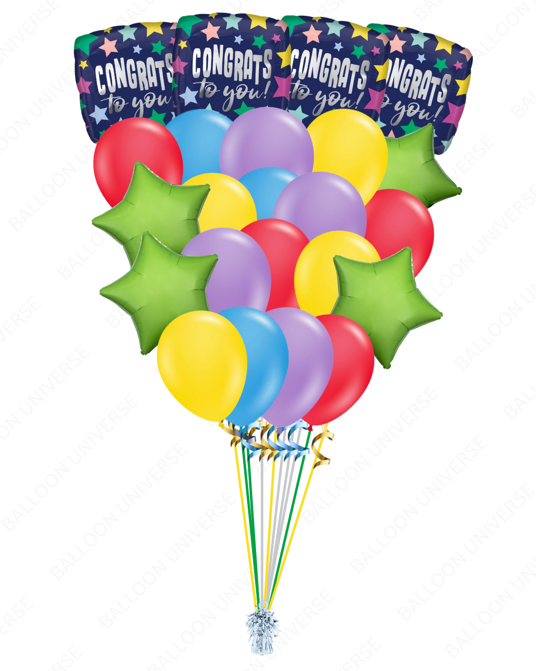 This bouquet blends elegance with βCongratsβ designs, green stars, and colorful latex balloons in red, purple, yellow, and blue. This set is perfect for birthdays, anniversaries, weddings, graduations, and other festive celebrations. All balloons in the bouquets are filled with helium. Available in three size variants.