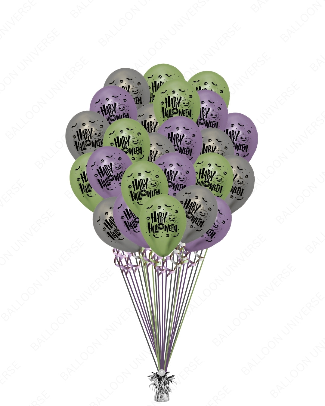 Halloween balloons featuring a mix of purple, green, and silver latex bring a colorful and festive touch to your decorations. Each balloon is printed with a cheerful Happy Halloween message, adding energy and brightness to your party setup. Perfect for Halloween party decorations, balloon arches, and indoor or outdoor displays.