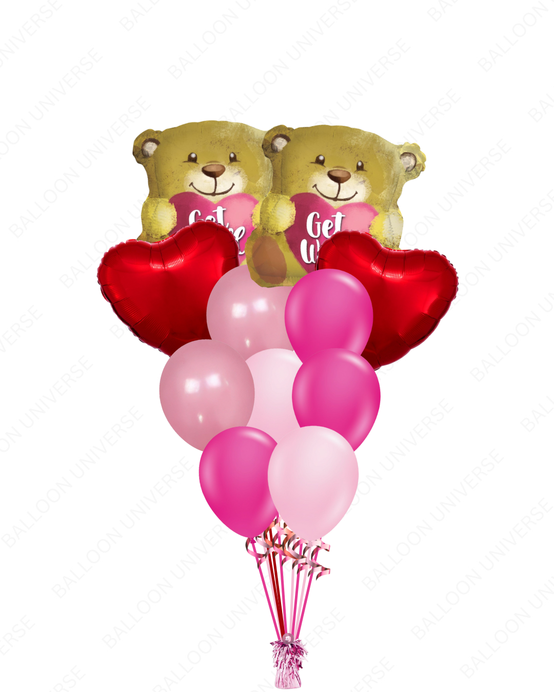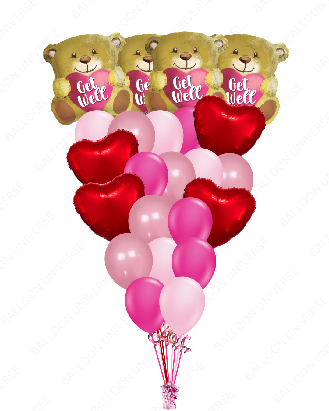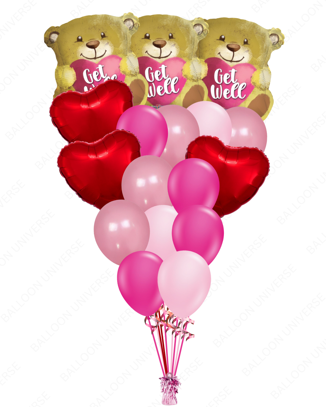 Brighten someone's recovery with this comforting get well balloon bouquet filled with helium. This features "Get Well" teddy bear mylars, red heart balloons, and latex balloons in hot pink, pink, and rose. The soft pink tones and teddy bear design create a warm, caring atmosphere. These helium-filled balloons work for hospital visits, home recoveries, or sending encouragement to someone feeling under the weather.