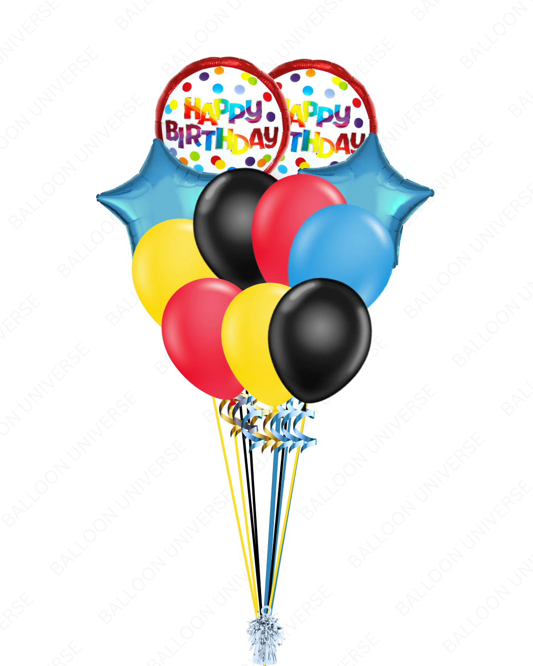 This colorful balloon set adds a vibrant energy to your birthday celebrations. It features a "Happy Birthday " round mylars, blue star mylars and a mix of red, yellow, blue, and black latex balloons. It brings a fun and festive atmosphere to your party. Available in three size variants to match your setup. All balloons are helium filled.