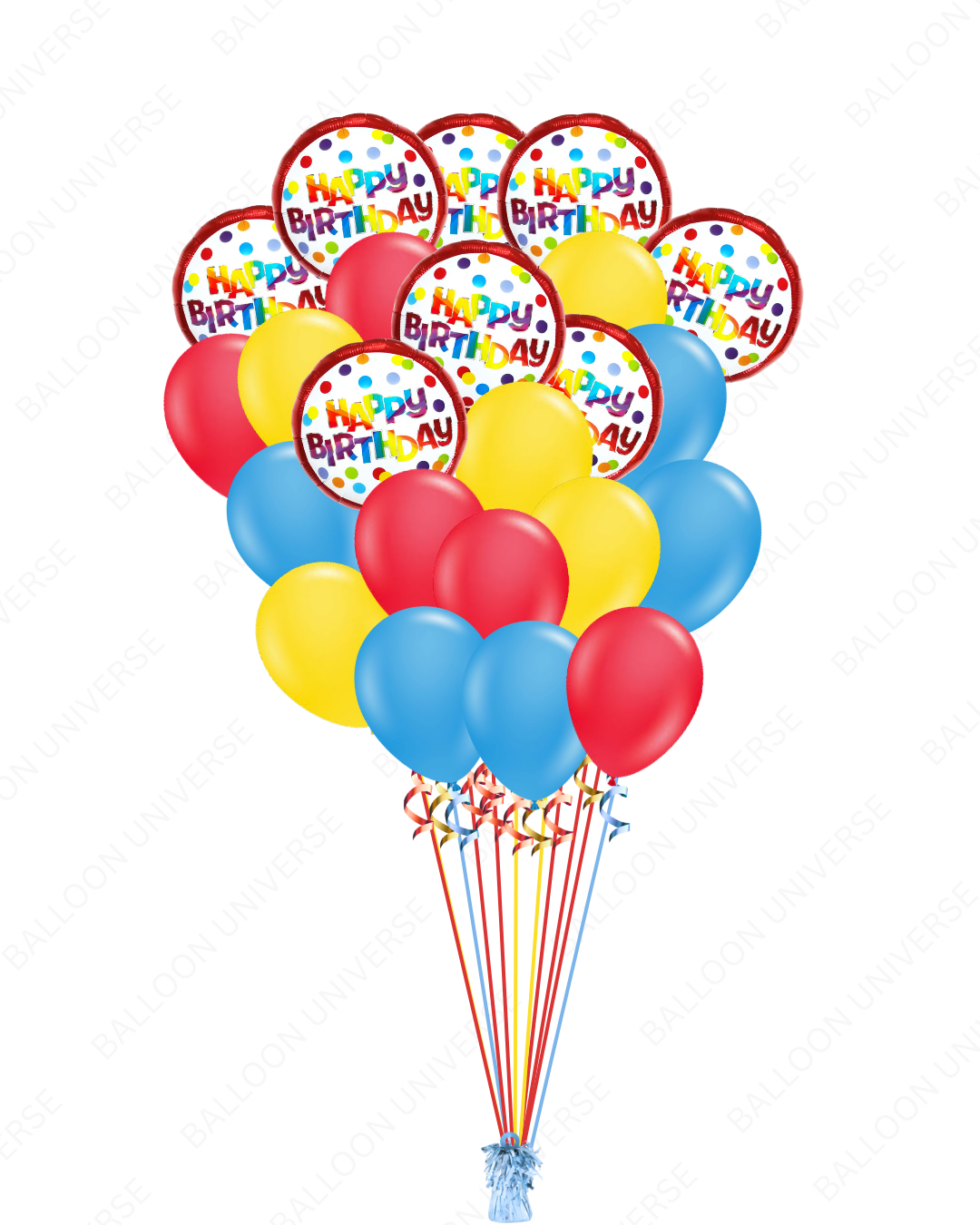 Birthdays are brightened up by this colourful balloon bouquet. It features colourful "Happy Birthday" mylar balloons with latex balloons. This set adds vibrant energy to any party space. This bouquet is perfect for kids, teens or adults and this versatile combo works for all ages and themes. Available in three size variants.