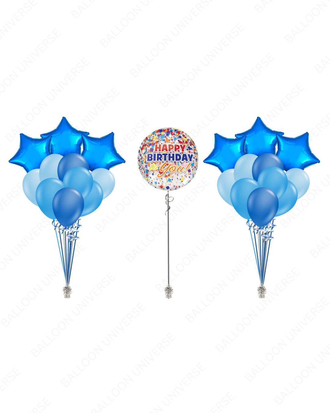 Bring bold color and personal flair to any celebration with blue birthday balloons. This setup includes two blue balloon bouquets that feature star mylar and latex balloons. This setup also contains an orbz with the "Happy Birthday" written on it. This makes it ideal for birthday celebrations. All mylar and latex balloons are filled with helium.