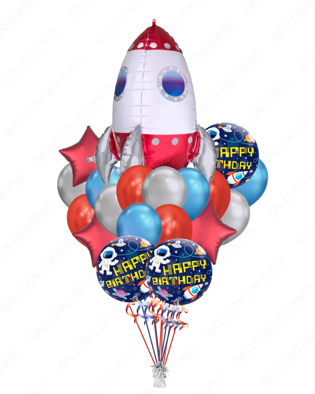 A rocket super shape balloon is the highlight of this bold space-themed bouquet. This set up includes a large super shape rocket balloons, chrome latex balloons (blue, red, silver), red star mylars and Happy Birthday balloons with outer space graphics. Perfect for space explorers and galaxy lovers. Available in 3 variants and also enjoy the Fast delivery.