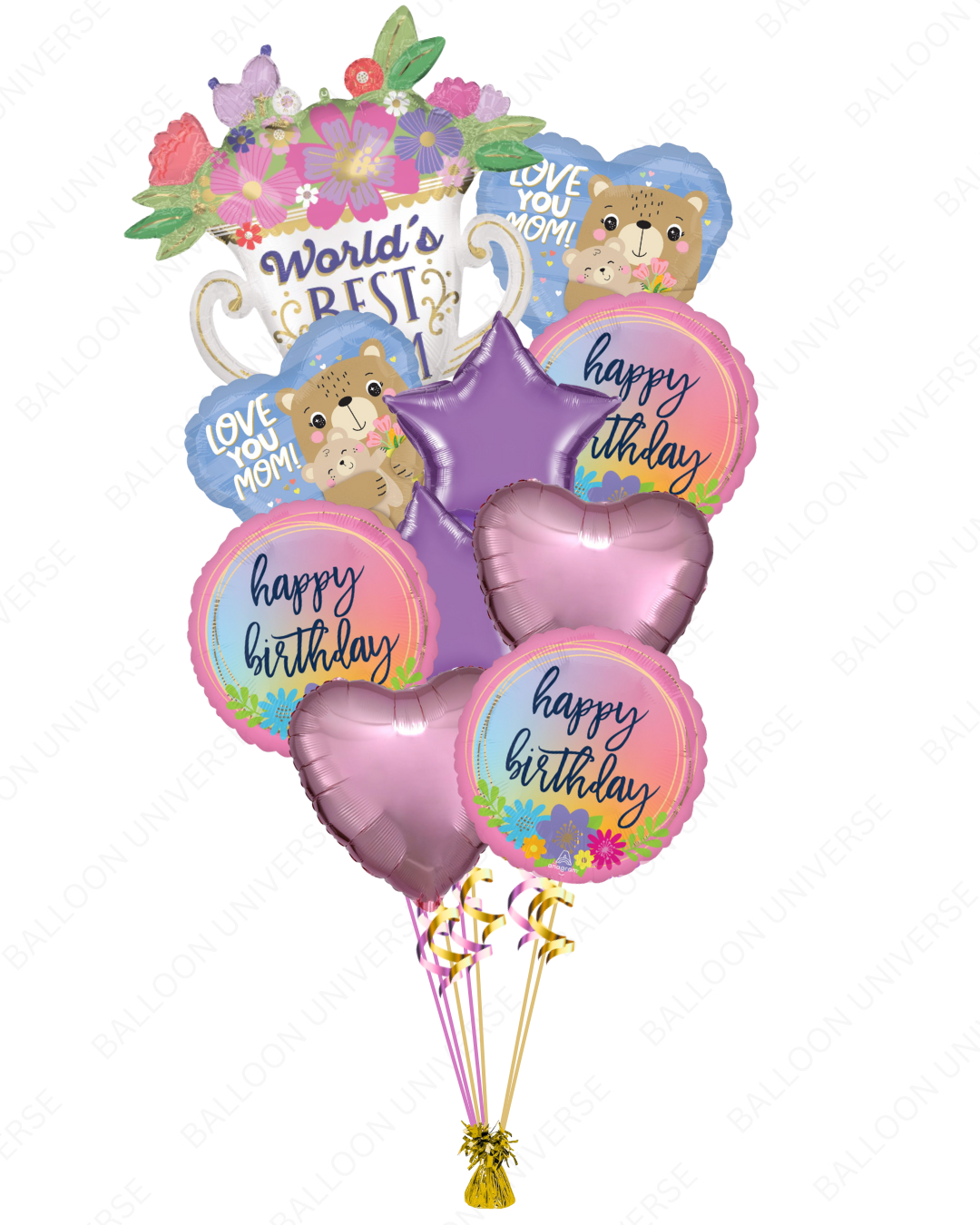 Celebrate Mom's birthday with this adorable bouquet. It comes with a stunning SuperShape “World’s Best Mom” balloon, complemented by charming I Love You Mom! hearts, Happy Birthday rounds, and elegant rose gold hearts with chrome purple stars. This elegant set is perfect for mom's birthday & Mother’s Day. Each balloon in the bouquet is helium-filled.