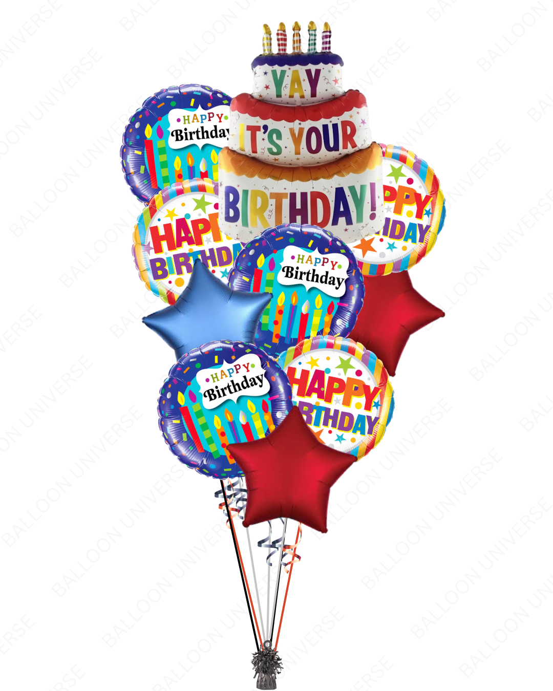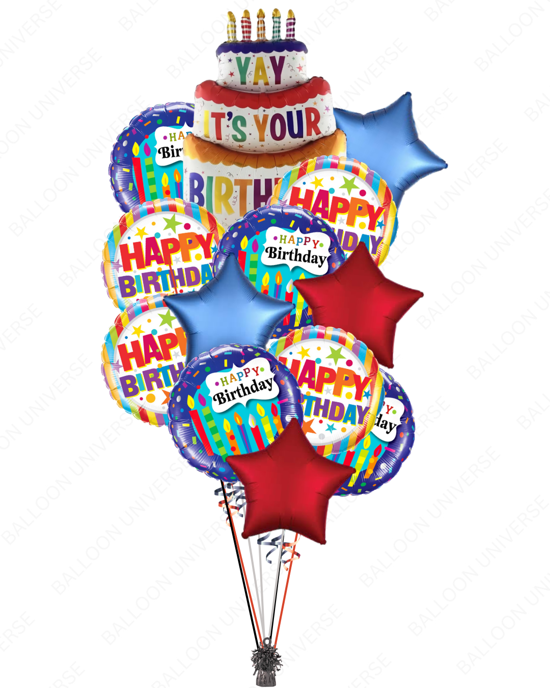 Make a powerful birthday statement with our Bold & Bright Birthday Balloon Bundle. This eye-catching arrangement combines a supershape "YaY It's Your Birthday" cake balloon with a dynamic mix of blue & red star balloons, and "Happy Birthday" round balloons. Available in three size variants. Each balloon in the bouquets is filled with helium.
