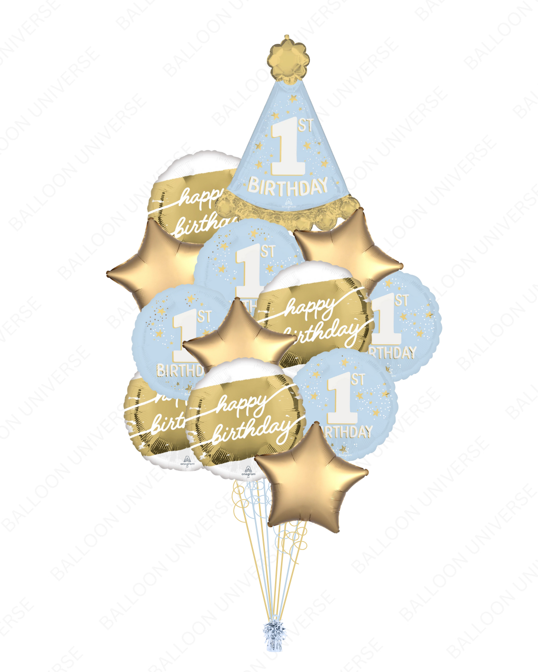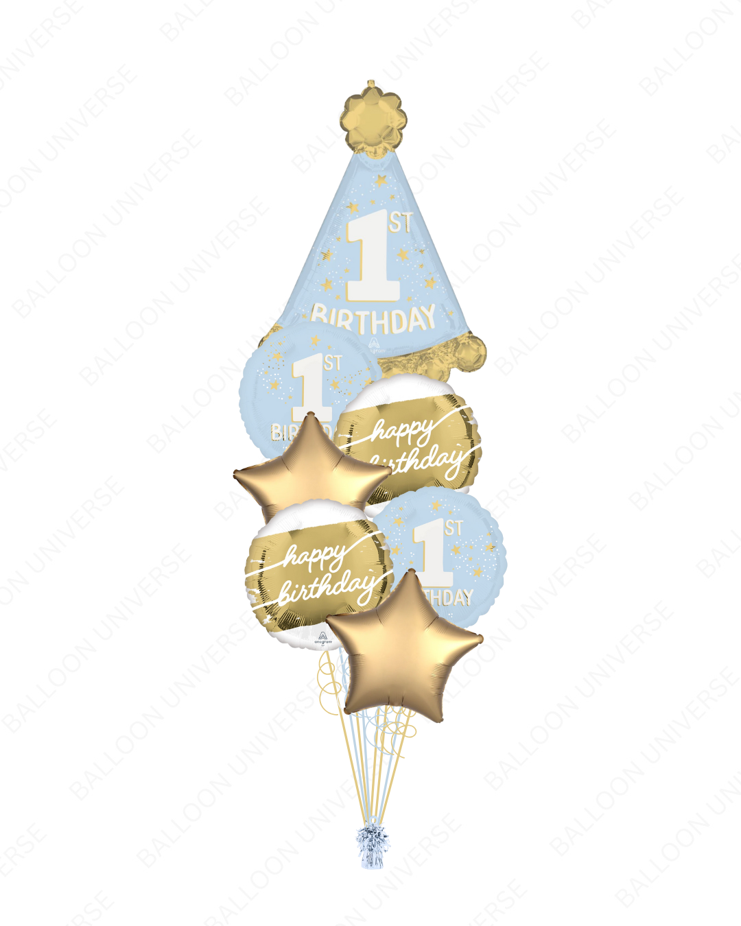 Brighten your boy's first birthday with a cheerful balloon bouquet filled with vibrant blues and festive shapes. This charming setup includes a standout cupcake mylar, birthday-themed designs and star accents that bring joy and excitement to the party space. Perfect for making his day feel extra special and full of smiles. Available in three size variants.