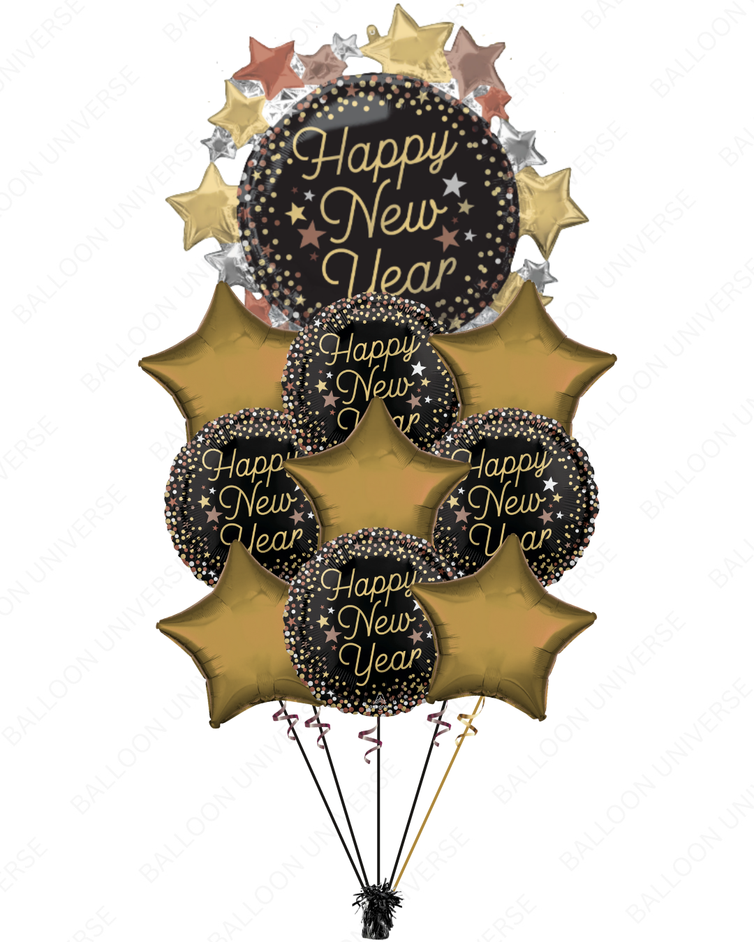 Celebrate the New Year in style with our Sparkling Stars Balloon Bundle. This festive set features a beautiful New Year Supershape balloon, shiny gold stars, and Happy New Year mylars. Perfect for New Year and countdown celebrations. Choose between Standard and Big sizes to match your celebration needs