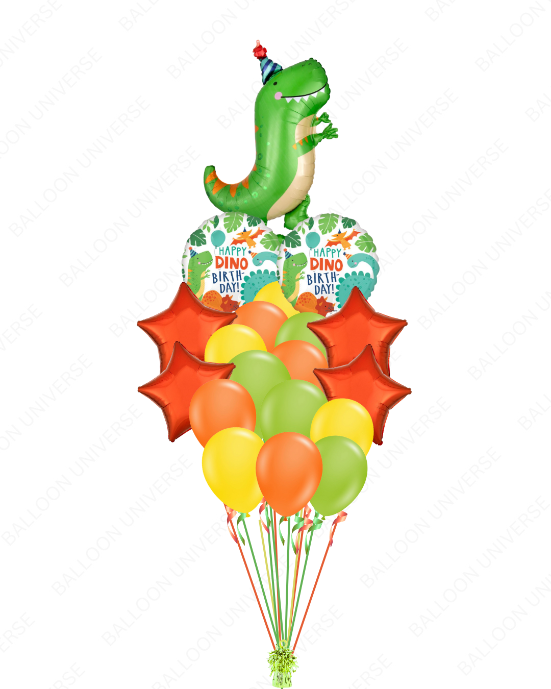 This bouquet is ideal for kids who love to shout "RAWR" and have a roaring good time! This playful bouquet features a large dino mylar, "Happy Dino Birthday" mylars, and latex balloons in green, orange & yellow. Get it for smiles, excitement, and a party that's truly dino-tastic! Available in three variants.