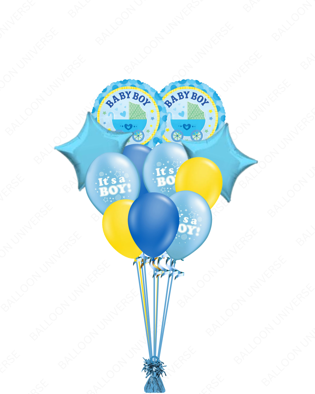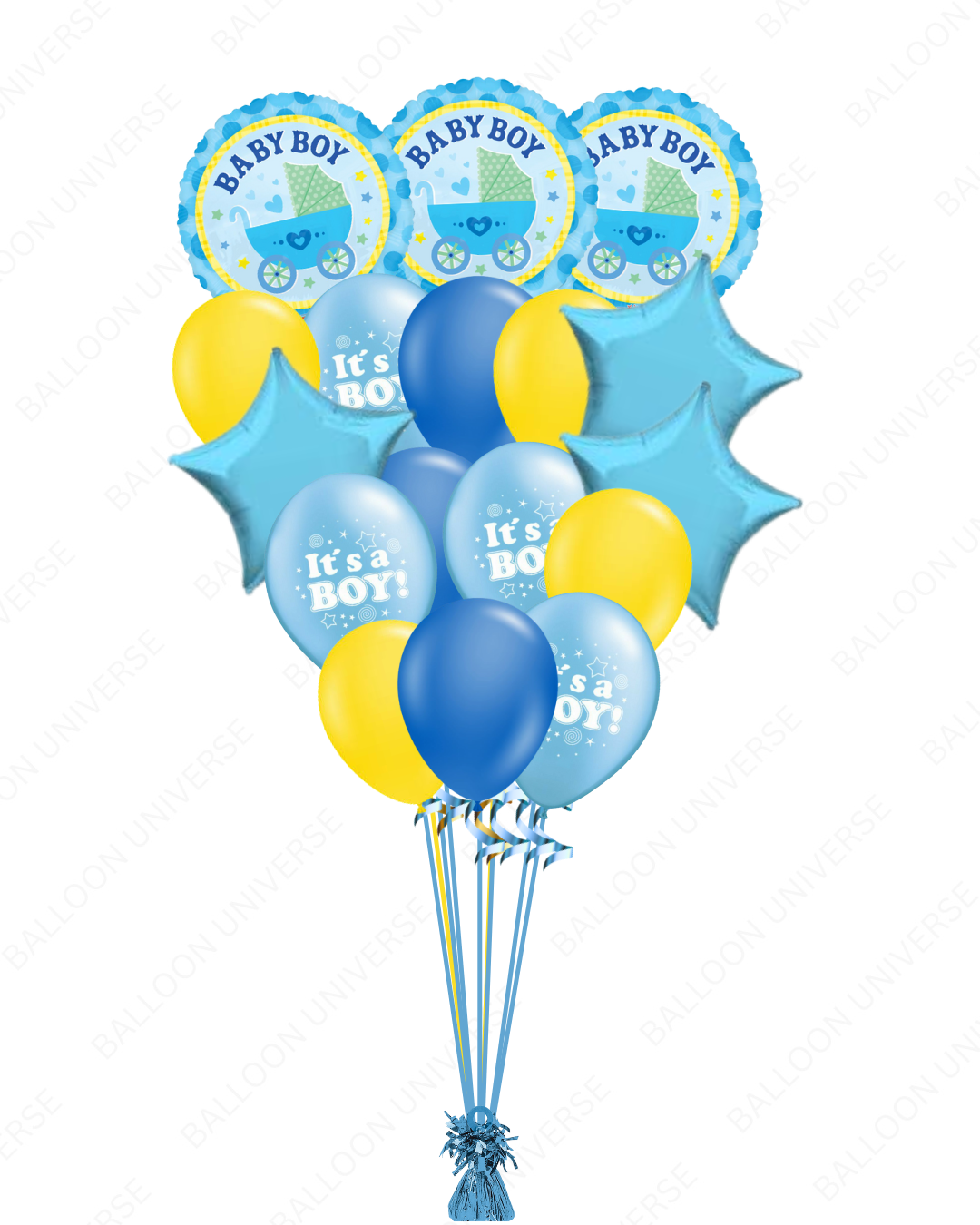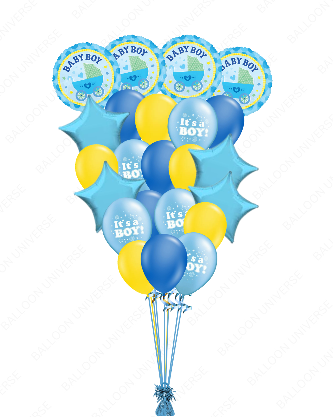 Our Baby Boy Balloon Set adds a festive touch to your baby shower. It includes baby boy latex balloons, 18" baby boy mylar designs, blue and yellow latex balloons, and blue star mylars. This set is perfect for baby showers, gender reveal parties, and newborn celebrations. All balloons are helium-filled. Available in three size variants.