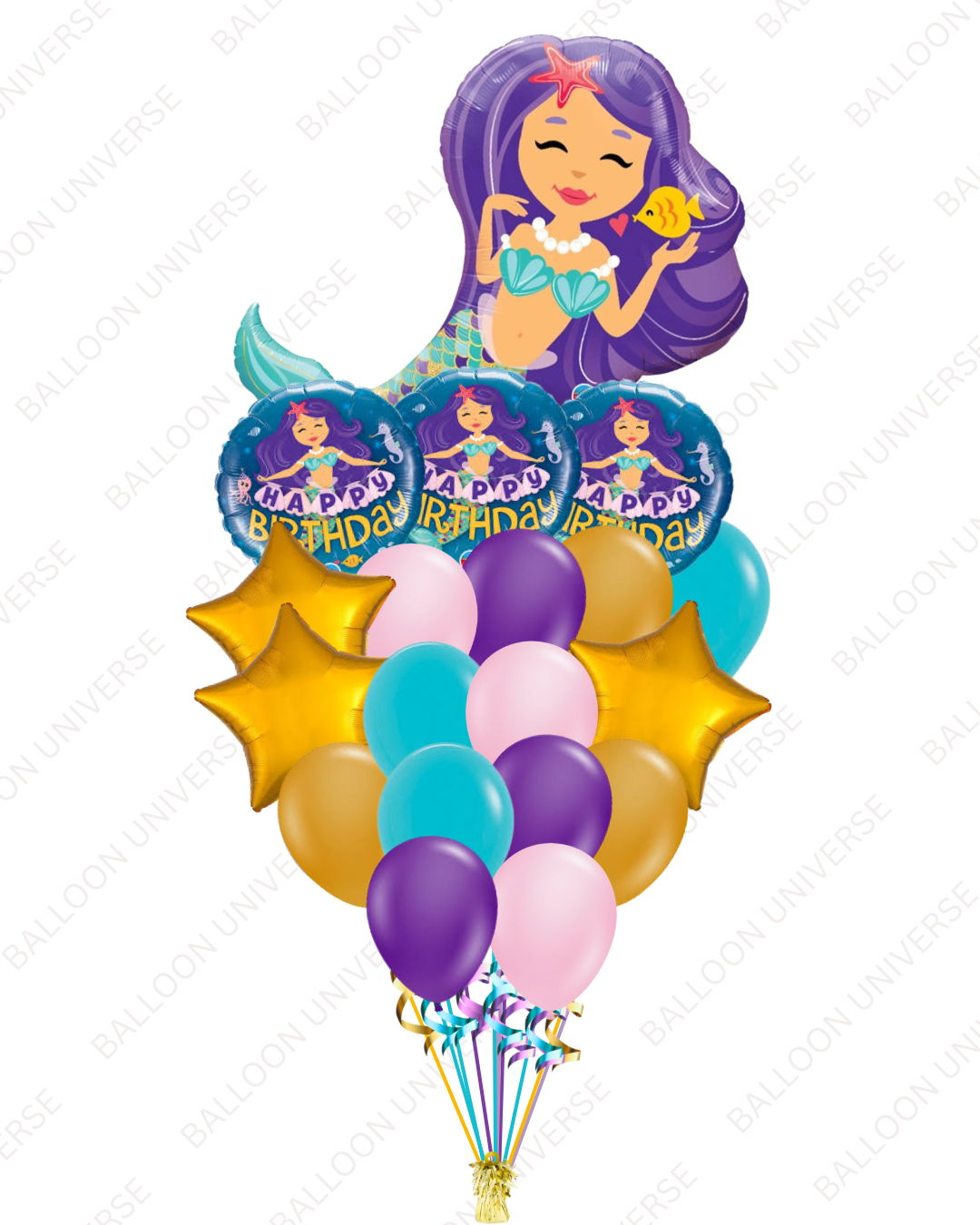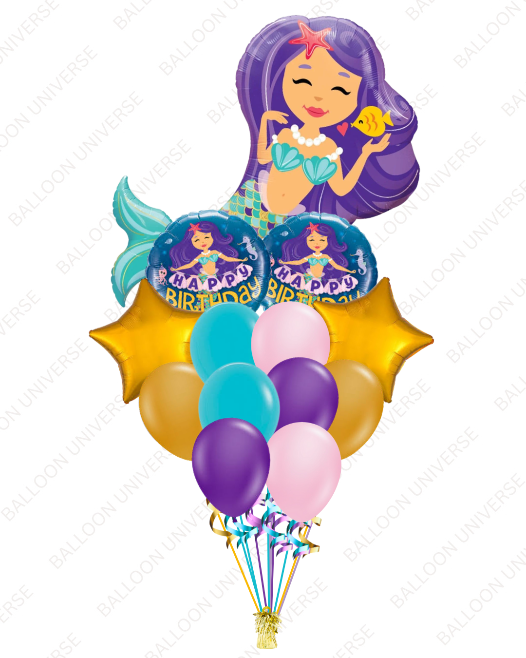 Make a splash with this vibrant mermaid-themed balloon set. This is perfect for ocean-loving birthday celebrations! This bouquet features a Supershape mermaid mylar balloon, 18" "Happy Birthday" mermaid round mylars, shimmering gold star mylars, latex In Gold, Turquoise, Purple, & Pink. This bouquet is perfect for a girl's birthday. Available in three size variants.