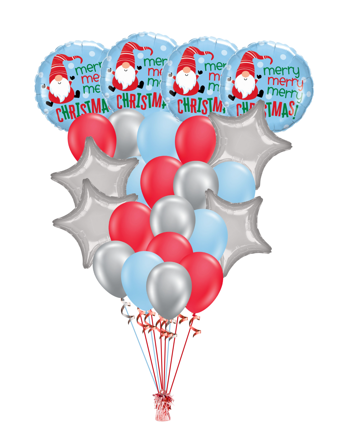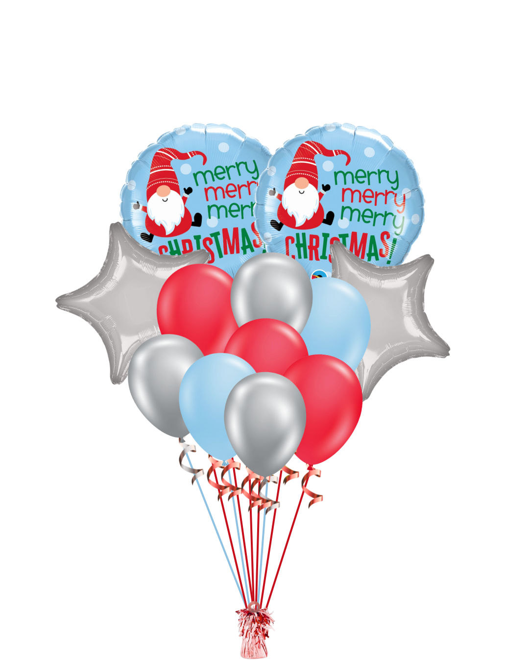Merry Merry Merry Christmas! This Balloon Set brings festive fun and charm to any Christmas celebration. Each set includes cheerful Gnome round mylars, metallic silver star mylars, and colorful latex balloons in red, silver, and baby blue. Available in Standard, Big, and Large sizes. All bouquets are helium-filled.