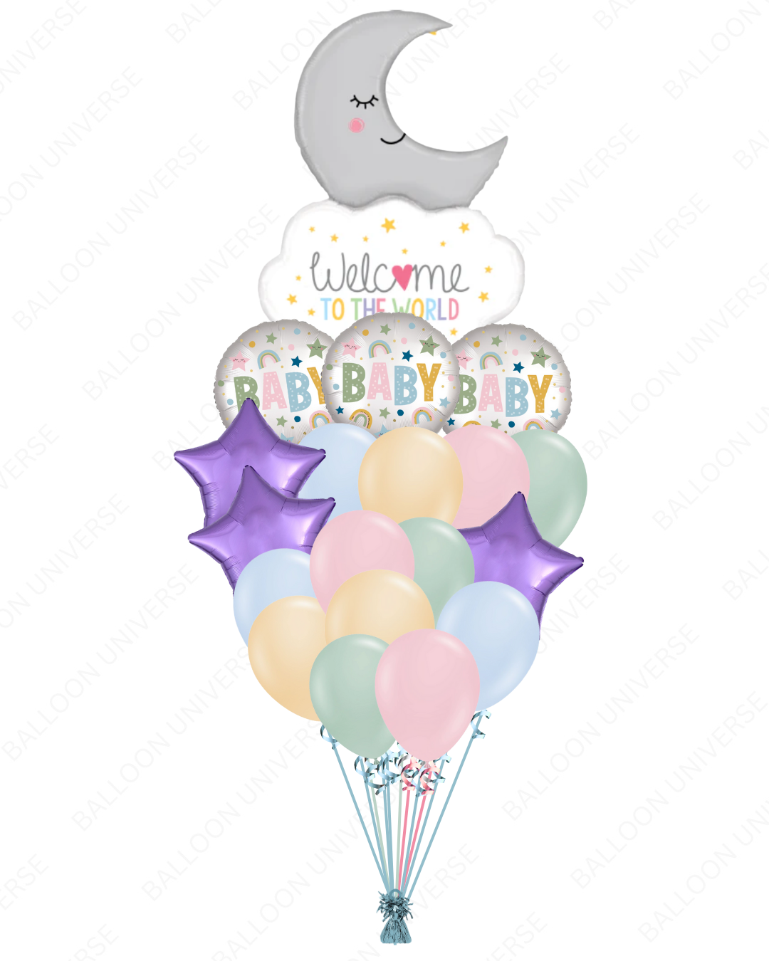 Create a charming welcome for the new arrival with our elegant balloon bouquet that features a crescent moon balloon, a supershape "Welcome to the world" round mylar, purple star balloons, "Baby" round designs, and pastel latex balloons in pink, blush mint, and blue. This set is perfect for baby showers or newborn celebrations. Available in three size variants.
