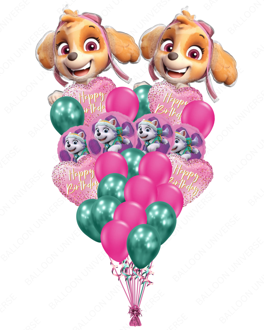 Celebrate your little one's special day with this adorable Skye & Everest-themed balloon bouquet. It features a Supershape Skye character balloon, Everest and Skye 18" mylars, pink "Happy Birthday" heart-shaped mylars and a vibrant mix of hot pink and chrome green latex balloons. A perfect pick for any Paw Patrol fan.