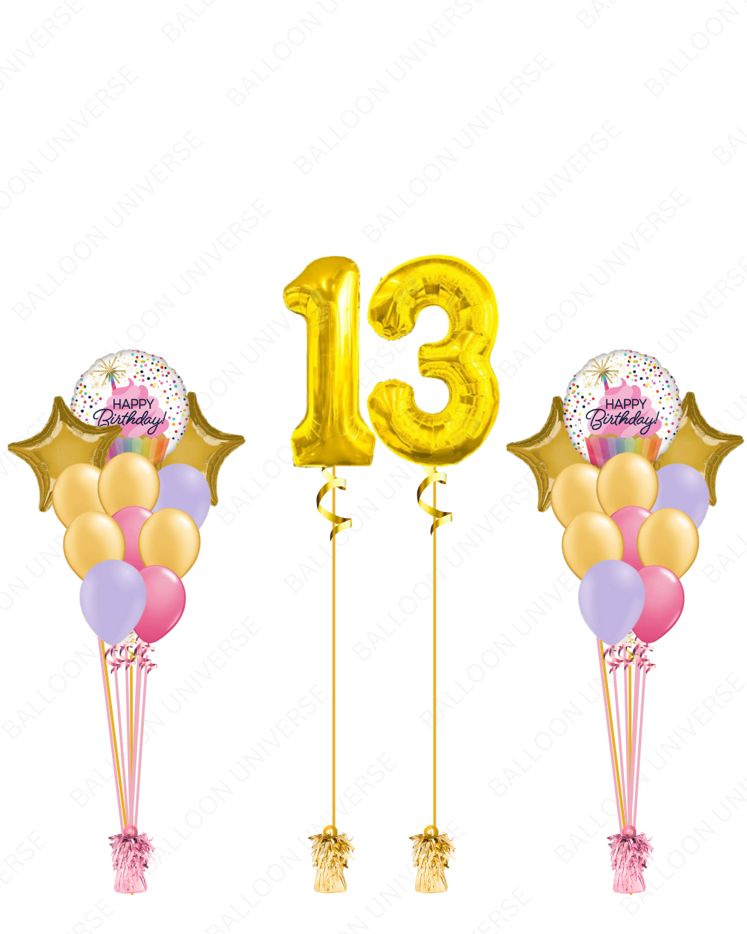 Here's the sweetest way to celebrate any age! This adorable package includes two customizable gold number balloons (pick whatever age you're celebrating), plus two charming bouquets with a "Happy Birthday" cupcake mylar, sparkly gold star balloons, and pretty latex balloons in gold, pink, and purple. The color combo is fun and festive without being too cutesy, so it works for kids, teens, or adults with a sweet tooth.