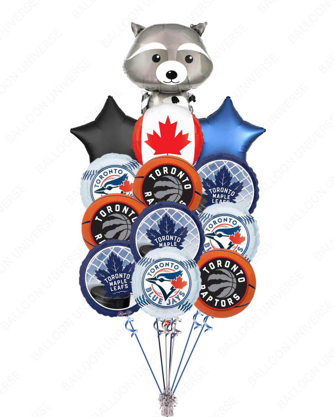 This Toronto-themed balloon bouquet features Toronto Maple Leafs, Blue Jays, and Raptors Mylar balloons, along with a playful Raccoon supershape balloon and shimmering black and blue stars. Whether you’re hosting a game night, sports-themed birthday, or Canada Day celebration, this balloon set adds excitement, color, and local spirit to your event. It’s the perfect décor for true Toronto fans!