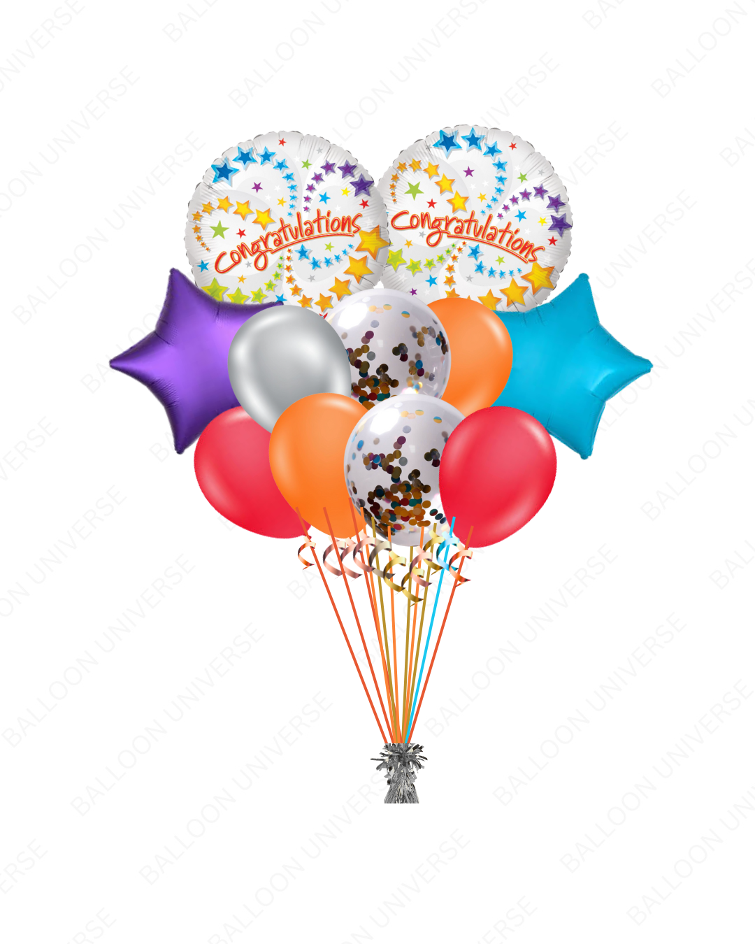 A colorful mix of “Congratulations” balloons featuring star-shaped mylars, confetti-filled latex, and bright latex balloons in orange, red, and silver. Perfect for celebrating graduations, promotions, new beginnings, or any special achievement. This vibrant bouquet adds instant joy and festive energy to any occasion.