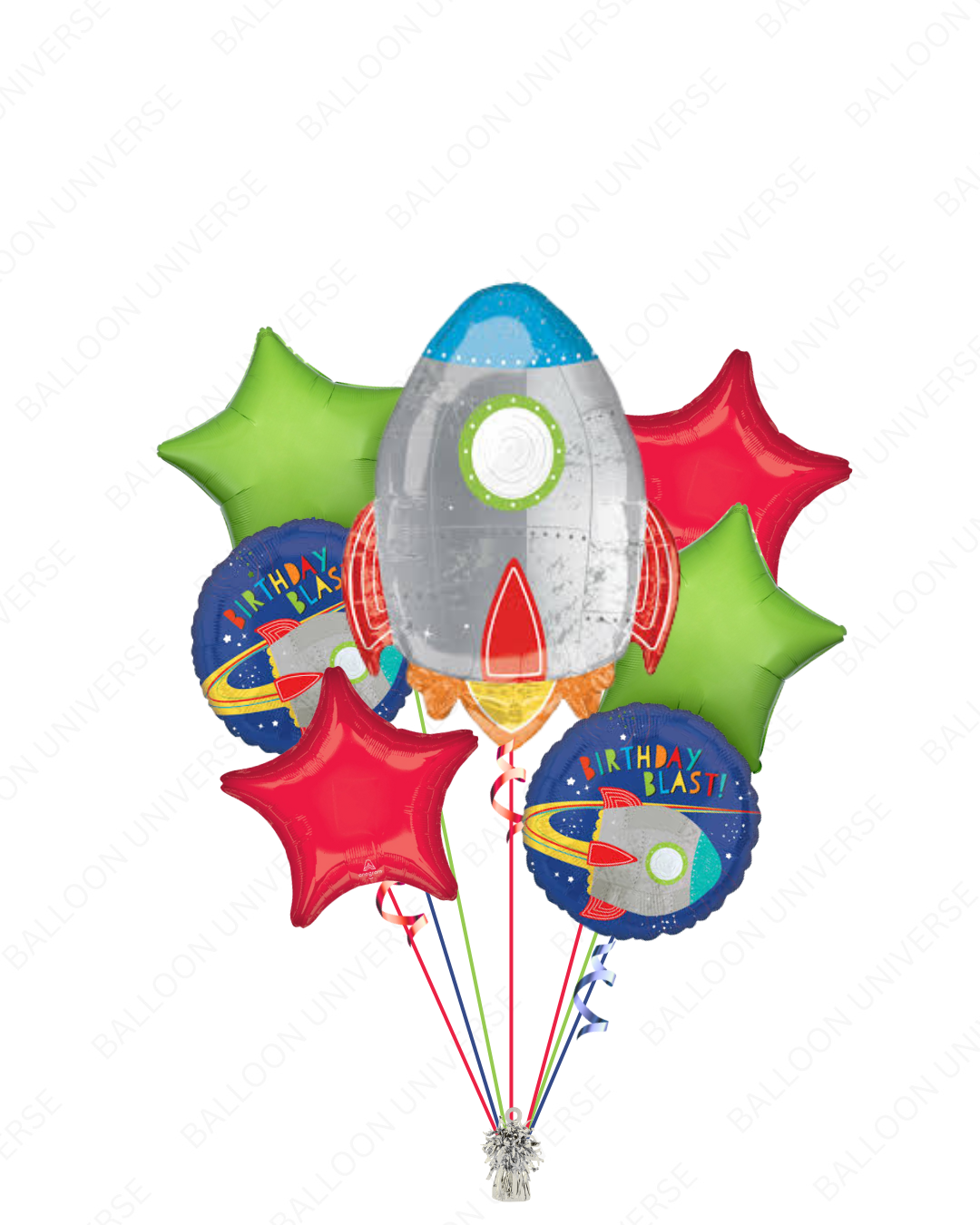 This rocket ship balloon bouquet brings all the space adventure excitement to your party! The star of the show is a fantastic supershape rocket ship mylar that looks like it's ready to zoom into orbit, paired with energetic "Birthday Blast!" round balloons and vibrant red and green star mylars. We've got two size options so you can match your party venue perfectly - the standard works great for home parties while the big set really fills up larger spaces.