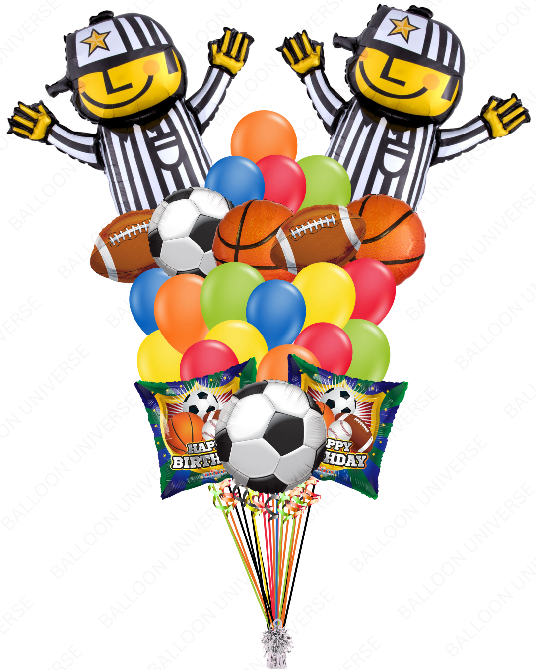 Bring the energy of the game to the party with a bold sports balloon bouquet made for your little MVP. This fun set includes aΒ "Supershape Referee Mylar", soccer ball, football, basket ball maylers and colorful balloons. These are perfect for sporty, high-energy kids. It creates a lively atmosphere and makes the birthday feel extra special. Available in three size variants.