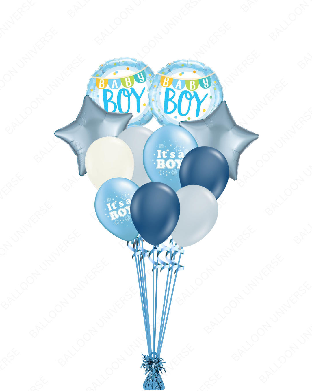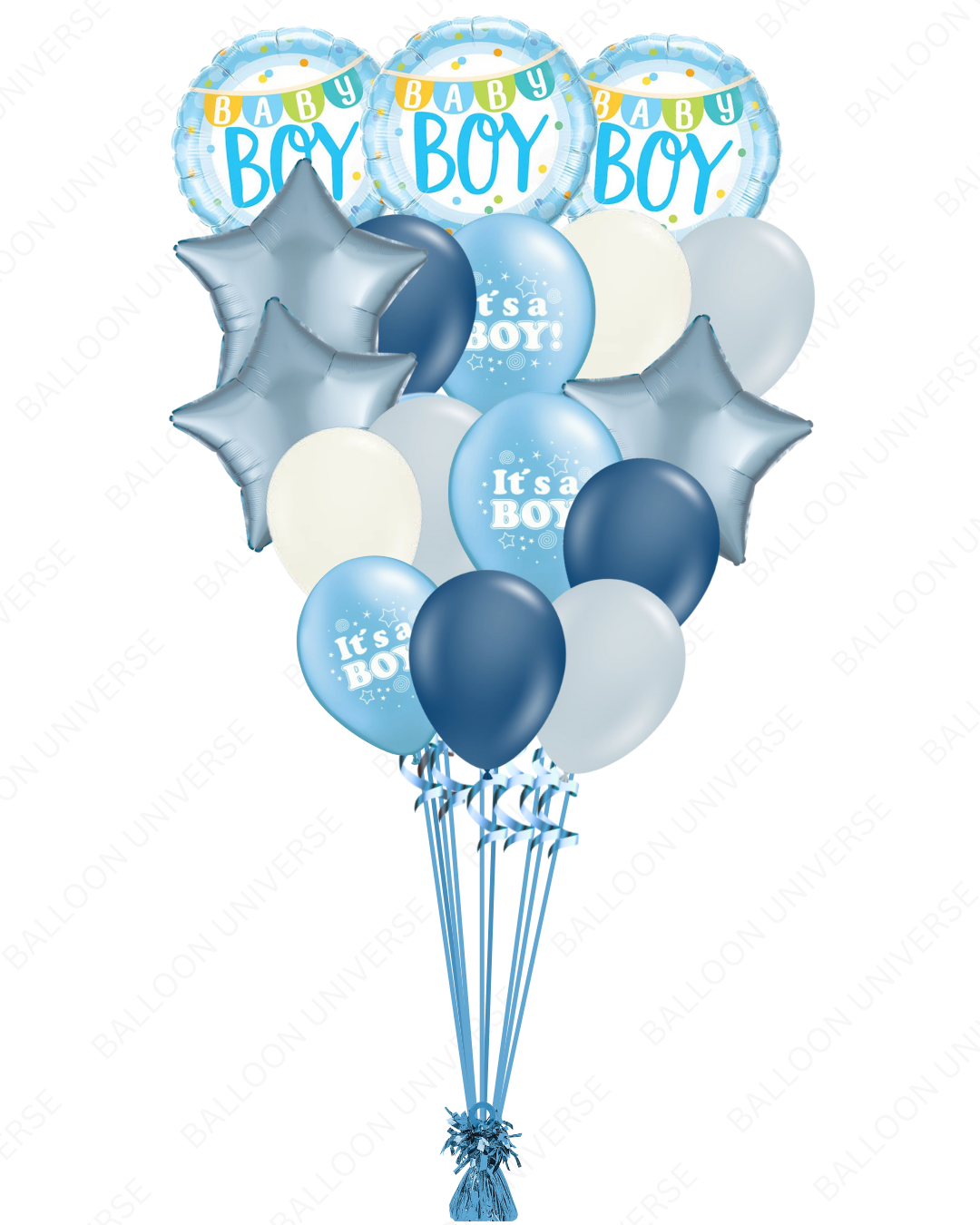 Celebrate your little one’s arrival with our elegant Baby Boy Balloon Bouquet. It comes with a "Baby Boy" round Mylar, shimmering blue stars, and soft latex balloons in dark blue, white, and silver. This set is perfect for baby showers, gender reveal parties, and newborn celebrations. All balloons are helium-filled. Available in three size variants.