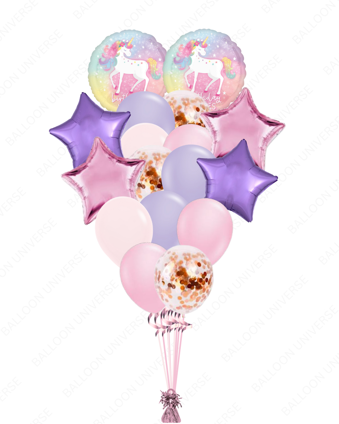 Create pure magic with this dreamy unicorn balloon bouquet that's perfect for any little one's special day! You'll get enchanting "Unicorn Birthday Wishes" mylars, pretty pink and purple star balloons, and a gorgeous mix of latex balloons in pink, purple, light pink, and show-stopping rose gold confetti. Available in three sizes to match your party needs, this set brings all those magical unicorn vibes without you having to stress about coordinating colors.