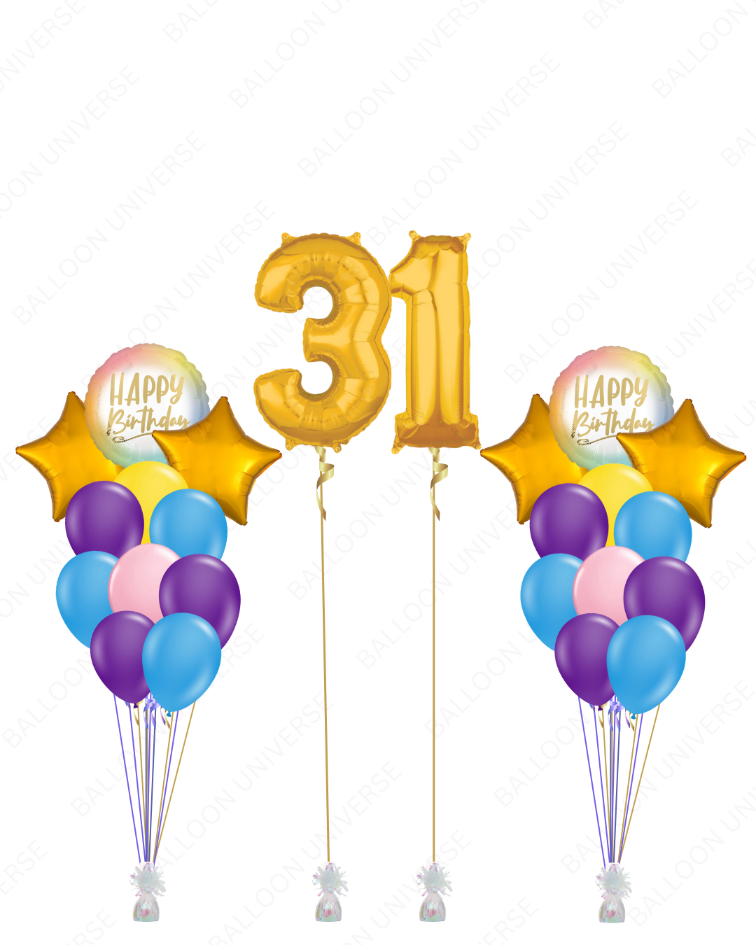 Here's the ultimate birthday decoration hack - customizable gold number balloons that work for any age, paired with two coordinating bouquets that pull the whole look together! You get those gorgeous supershape gold numbers (pick whatever age you're celebrating), plus bouquets with "Happy Birthday" mylars, shimmering gold star balloons, and a fun mix of latex balloons in blue, purple, and yellow. All balloons are filled with helium.