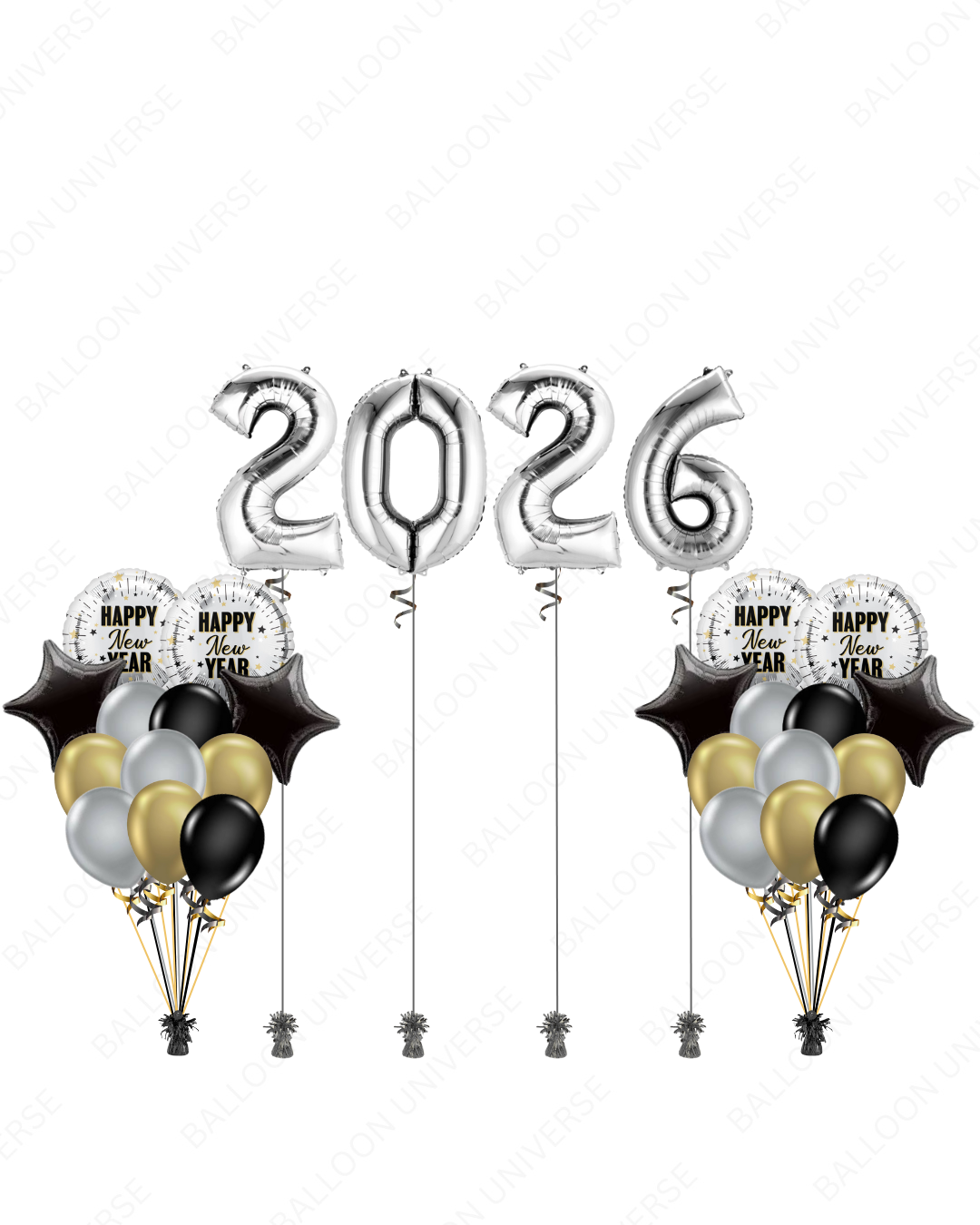 Welcome the New Year (2026) in style with our Silver Number Balloon Setup! This festive set includes a 34” helium-filled silver 2026 number mylar and two bouquet sets featuring Happy New Year round mylars, black star mylars, and colorful latex balloons in silver, black, and gold. Perfect for parties, events, or home décor, this set adds a sparkling and joyful touch to your New Year celebrations. Each balloon in the setup is filled with helium.