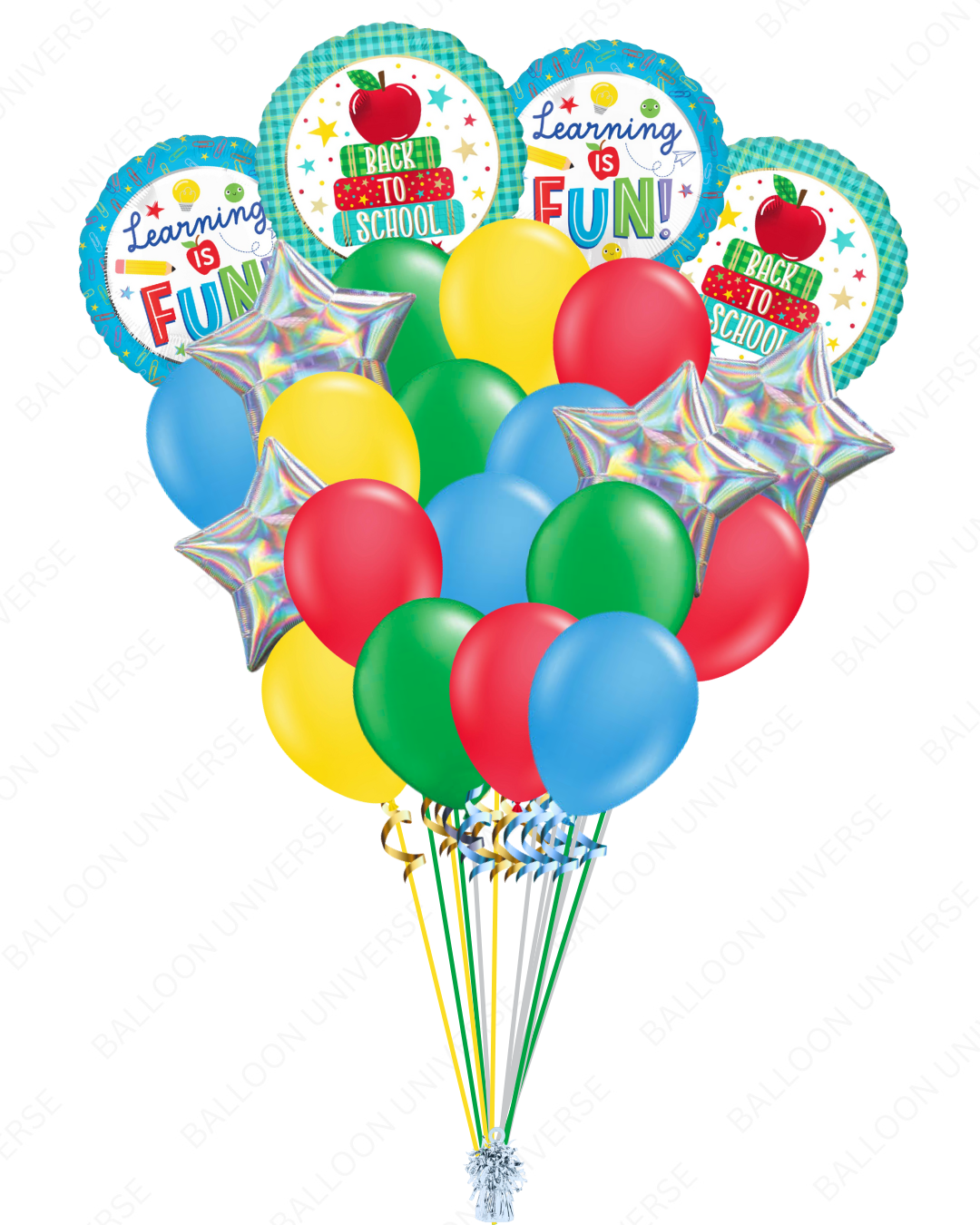 Welcome students and teachers back with our colorful Welcome Back to School Balloon Bouquet. This cheerful arrangement features bright “Back To School” and “Learning Is Fun” Mylar balloons, sparkling iridescent stars and a mix of vibrant latex balloons in red, green, blue and yellow. This set is perfect for classrooms, school events or back-to-school parties. Available in three size variants.