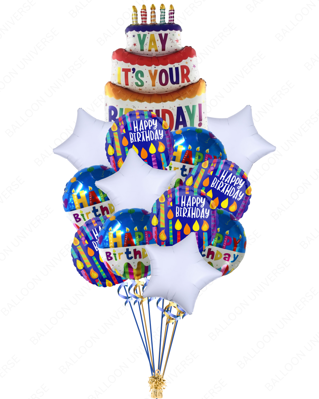 This bouquet features a vibrant Supershape cake balloon paired with a mix of birthday-themed round mylars and elegant white metallic star balloons. Each balloon is made from high-quality and durable material. Available in three size variants. All are filled with helium.